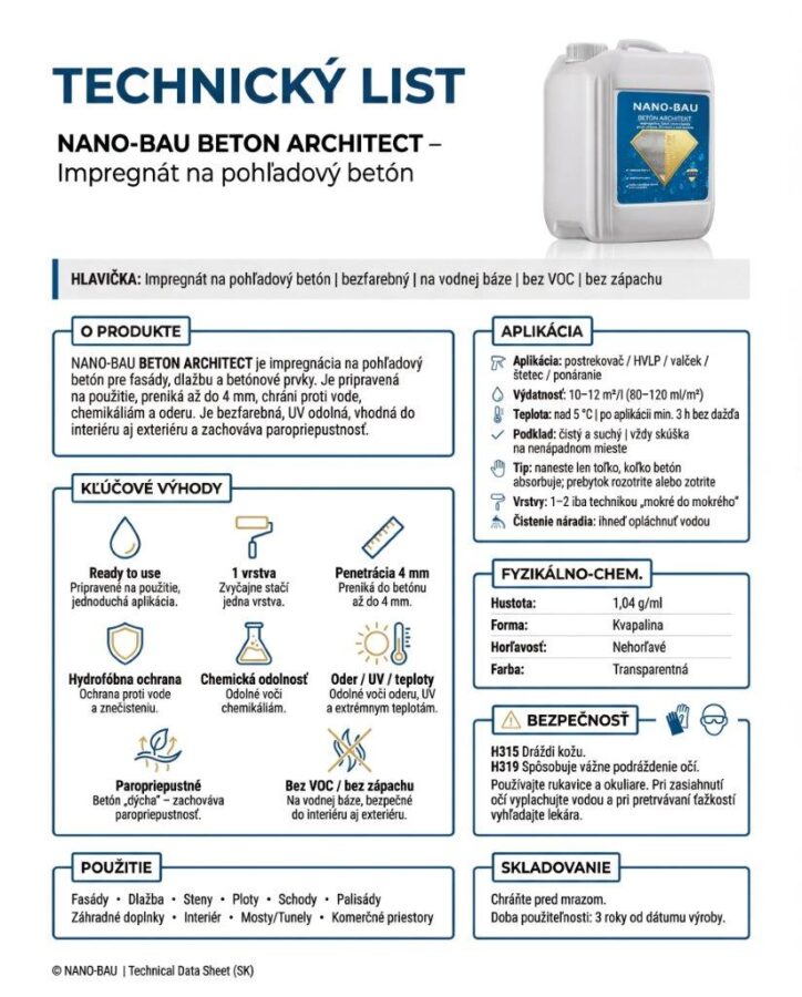 Nano-Bau BETON ARCHITEKT – Impregnácia na pohľadový betón je penetračná impregnácia na vodnej báze na báze nanotechnológie určená na bezfarebnú ochranu povrchov z vysokohustotného hladkého betónu. Prípravok účinne impregnuje a silne hydrofobizuje povrchy betónov vyšších tried, t.j. C25, C30, C35. Vďaka použitiu impregnácie nepreniká voda a iné nečistoty do vnútra betónových povrchov. Hydrofobizácia povrchu chráni podklad pred prenikaním solí rozpustených vo vode, kyslými dažďami znižujúcimi pH betónu a inými látkami, ktoré spôsobujú koróziu výstuže, trhliny, eróziu, rast machov, výkvety solí alebo nečistoty.