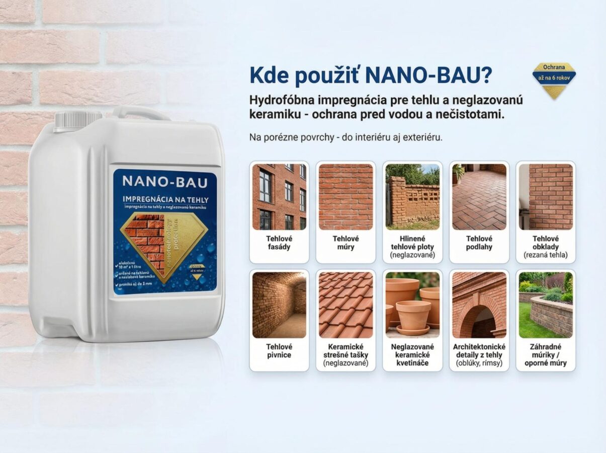 Nano-Bau Impregnácia tehál a neglazovanej keramiky je impregnácia vytvorená a určená pre neglazované tehly, neglazované keramické škridly, ručne tvarované tehly a iné prvky zo savej (neglazovanej) keramiky. Impregnácia preniká do tehly až do 5 mm a chráni ju pred nečistotami, dažďom a inými škodlivými faktormi. Výrobok je určený na použitie na tehly, neglazované klinkery, tehlové obklady, tehlové steny, tehlové podlahy a steny. Poskytuje vlastnosti STAY-CLEAN – čím účinne chráni povrchy pred nečistotami a škvrnami po mnoho rokov. Vhodné pre použitie v interiéri aj exteriéri.