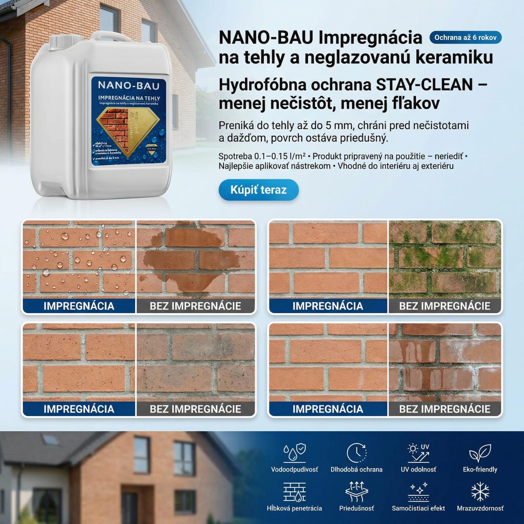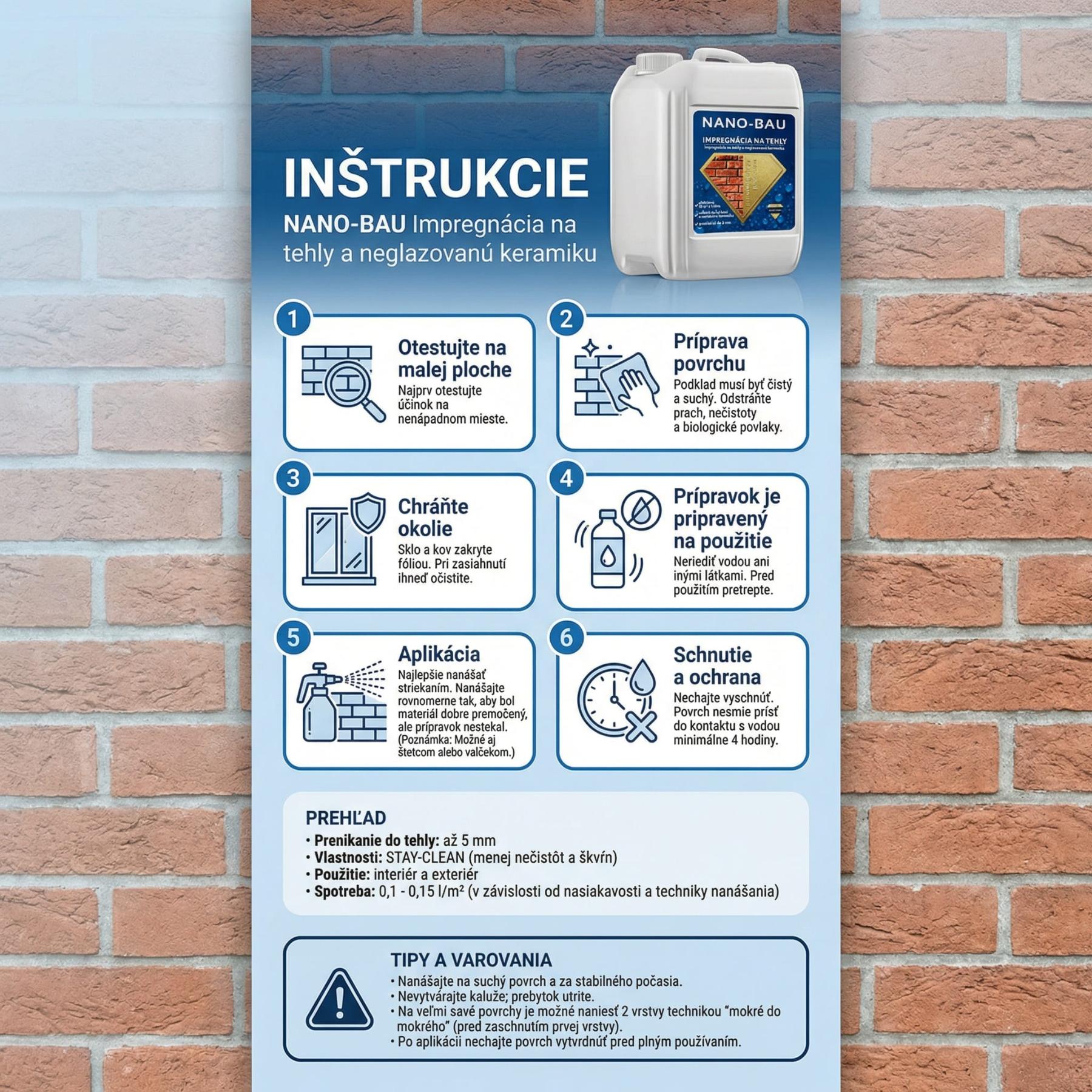 Nano-Bau Impregnácia tehál a neglazovanej keramiky je impregnácia vytvorená a určená pre neglazované tehly, neglazované keramické škridly, ručne tvarované tehly a iné prvky zo savej (neglazovanej) keramiky. Impregnácia preniká do tehly až do 5 mm a chráni ju pred nečistotami, dažďom a inými škodlivými faktormi. Výrobok je určený na použitie na tehly, neglazované klinkery, tehlové obklady, tehlové steny, tehlové podlahy a steny. Poskytuje vlastnosti STAY-CLEAN – čím účinne chráni povrchy pred nečistotami a škvrnami po mnoho rokov. Vhodné pre použitie v interiéri aj exteriéri.
