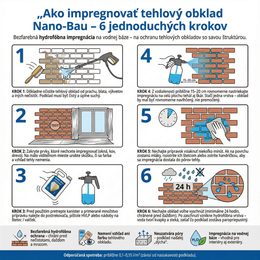 Prípravok NANO-BAU TEHLA RUČNE TVAROVANÁ je určený na použitie na tehly, staré tehly, tehlové obklady na steny, podlahy a steny. Poskytuje vlastnosti STAY-CLEAN – čím účinne chráni podklad pred nečistotami, vlhkosťou, mrazom a odštiepením až po dobu 8 rokov. Pre použitie v interiéri aj exteriéri.