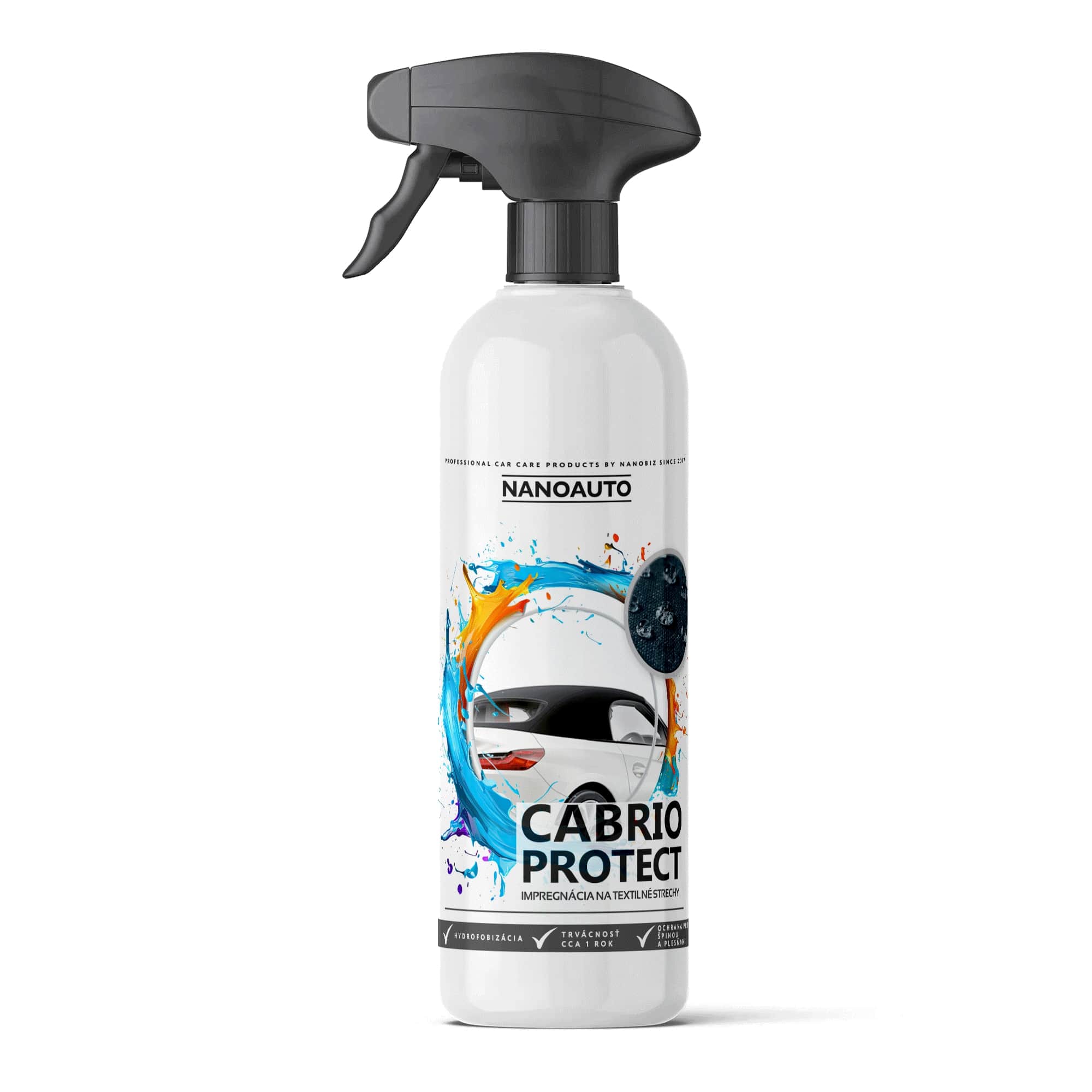 NANOAUTO Cabrio Protect je inovatívna impregnácia s obsahom nanočastíc vyvinutá pre hydrofóbnu impregnáciu látkových striech kabrioletov. Vďaka použitiu nanotechnológie vytvára prípravok silný a odolný nanopovlak, ktorý chráni každé jednotlivé vlákno chráneného materiálu proti vode a nečistotám.