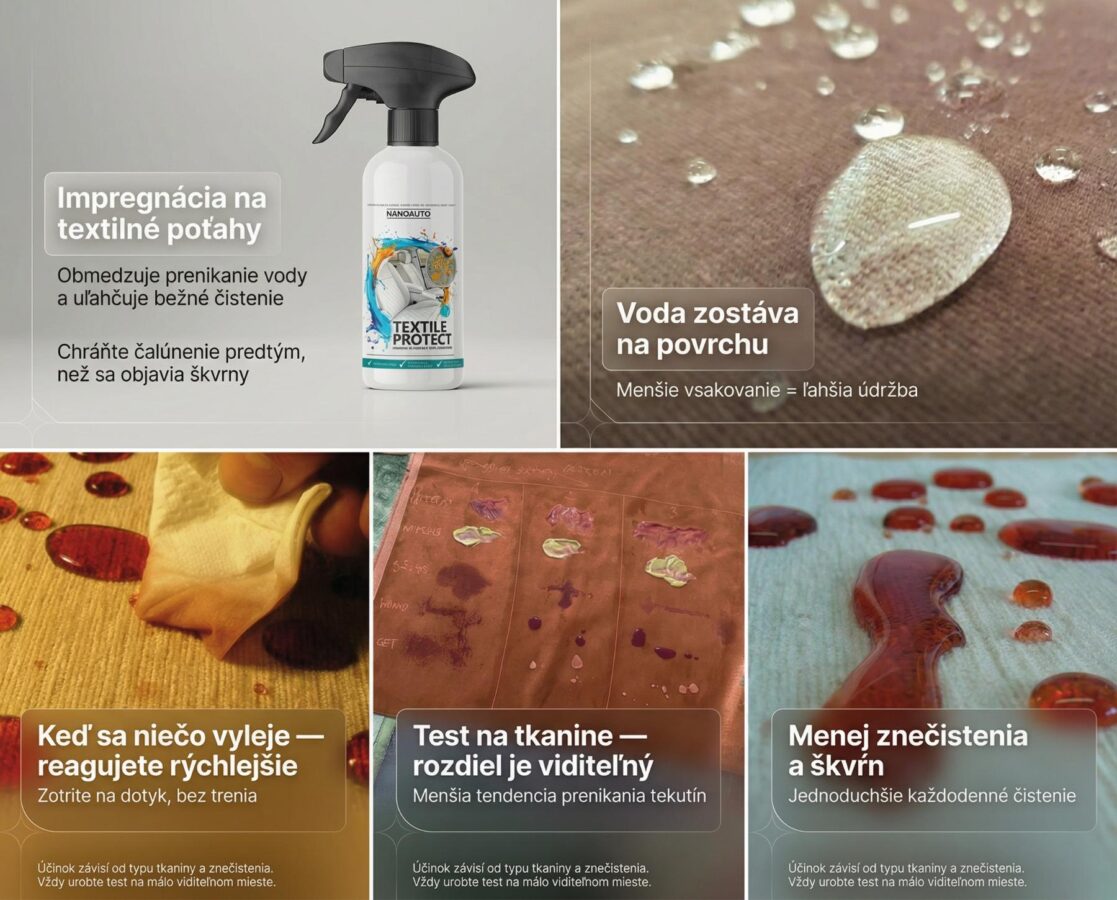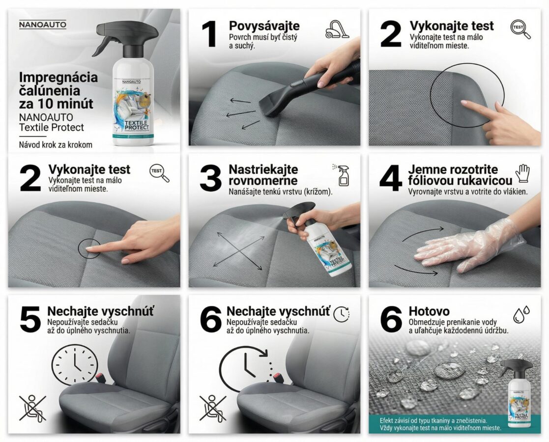 NANOAUTO TEXTILE PROTECT Impregnácia na autopoťahy je špeciálne vyvinutá impregnácia, ktorá účinne chráni prírodné a syntetické tkaniny, zamatové prvky, poťahy sedadiel a iné textilné materiály. Funguje tak, že okolo každého jednotlivého vlákna vytvorí neviditeľný povlak hrubý niekoľko nanometrov.