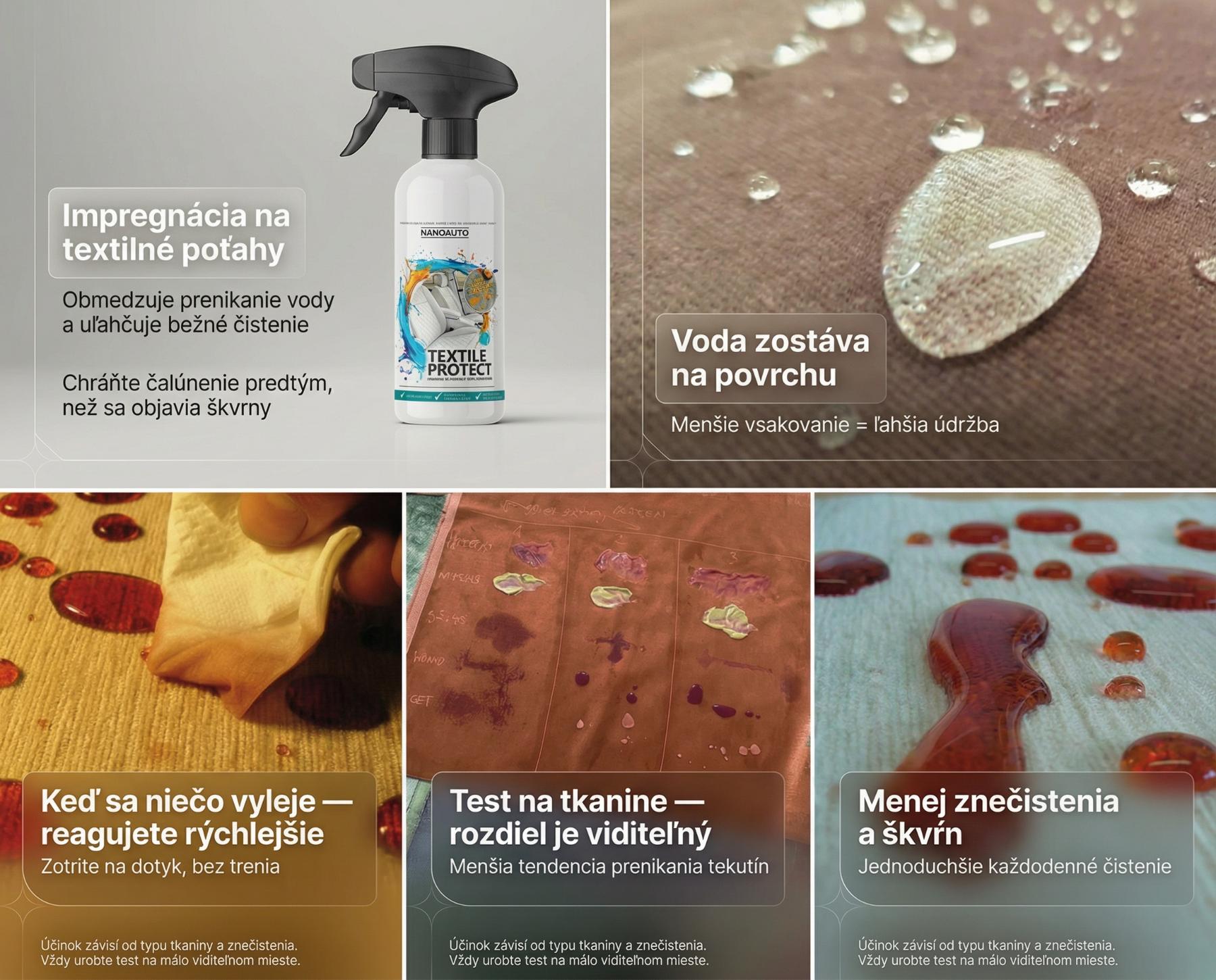 • Ochrana proti absorpcii tekutín: Vďaka nanopovlaku NANOauto Textile Protect účinne chráni textilné materiály pred absorpciou tekutín a poskytuje ochranu proti škvrnám a nečistotám.